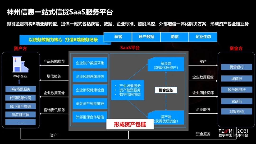 9月29日, TECH数字中国2021技术年会——“场景创新·赋能高质量发展” 主题论坛上,神州信息重磅发布自主研发的“一站式信贷SaaS服务平台”。该平台赋能金融机构B端业务转型,提供一站式包括获客、数据、企业标准、智能风控、外部增信一体化解决方案,形成资产包全链业务,为服务实体经济,助推中小微企业新发展提供有力支持。